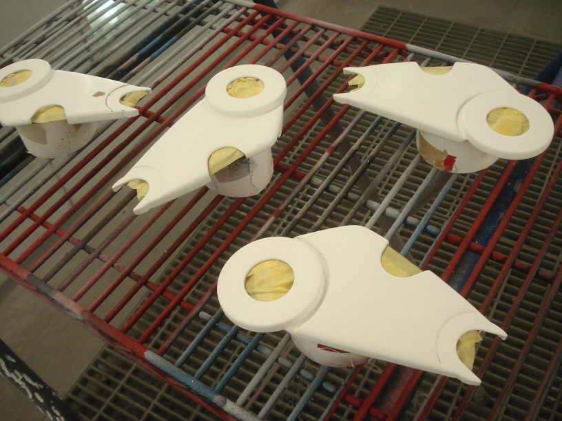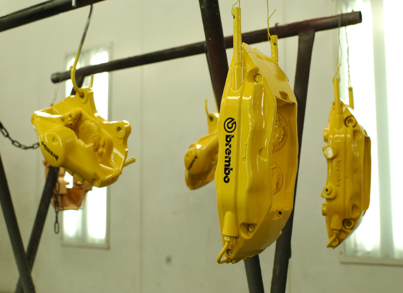 が、私がいつも塗っているブレーキ屋さんのキャリパーは、本当に「塗るだけ」でして、私の下に来る時は剥離〜脱脂洗浄〜マスキングまで全部終わってます。 なので短時間で3セットくらいまとめて塗ってしまったりするので数がこなせていたりします(当然お値段も安くなってます)。