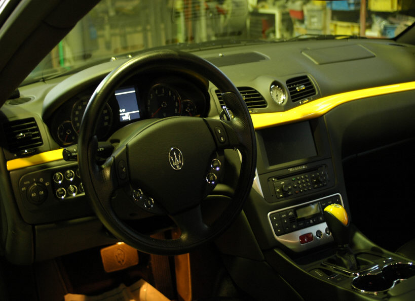 ルーテシアの内装モールは、ボディ同色のイエローパールにご依頼頂いてますが、こちらのマセラッティはボディは黒メタです。 なので室内のイエローはボディとは全然関係無いのですが、意外とこれも良い感じですね。