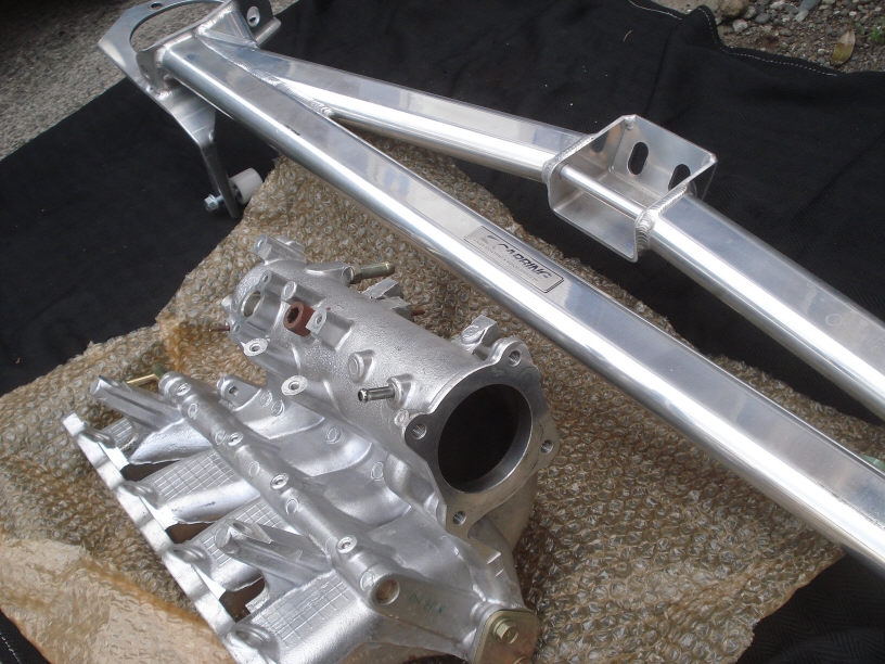 こちらはランエボワゴンに装着予定のインマニとタワーバーですね。 インマニは「黒」の結晶塗装で、タワーバーは「赤」の結晶塗装でご依頼頂きました。
