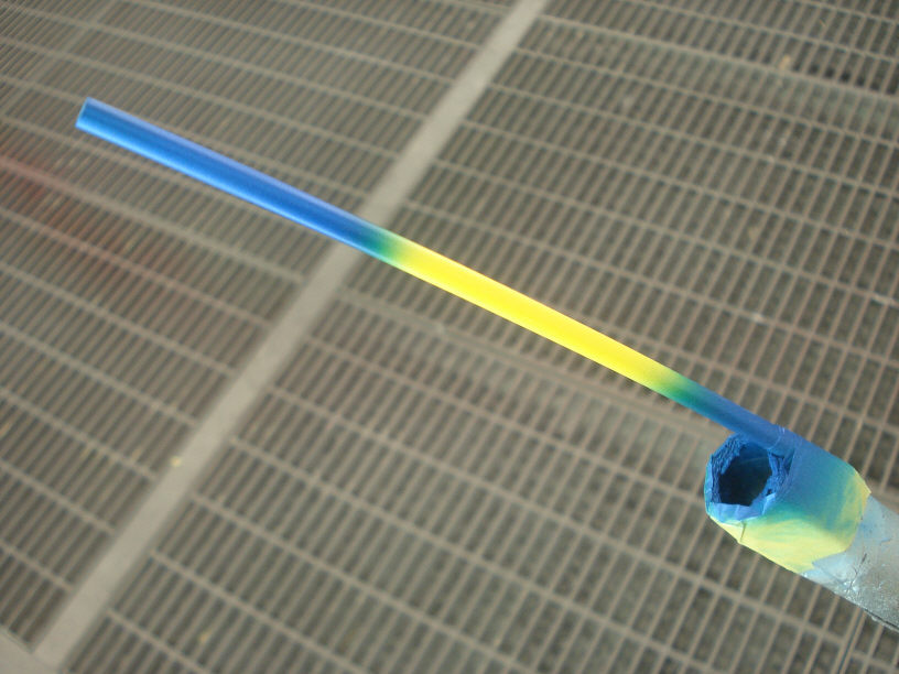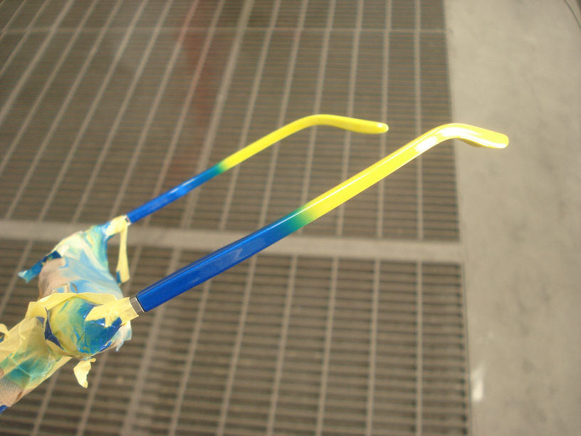 今回のメガネフレームでは「ブルーとイエローメタリックのグラデーション」でご依頼承っております。 流石にいきなり本塗りに入ったりはしません(恐ろしくて出来ません)ので、フレームに見立てた「プラ棒」でテスト拭きを行います。