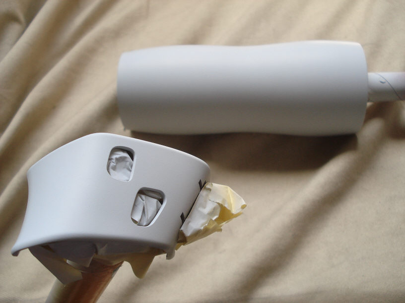 が、作業はやはり困難を極めます。 まずメッキですが、このまま塗っても剥がれますのでメッキは剥がしてしまいます。 レンズその他装着品は外れていますが、ツルとの接合部分の蝶番がちょっと特殊でこれは外せそうもありません。なのでここはガッチリマスキングしてサンドブラストに挑みます。ビニールテープとガムテープでグルグル巻きです。