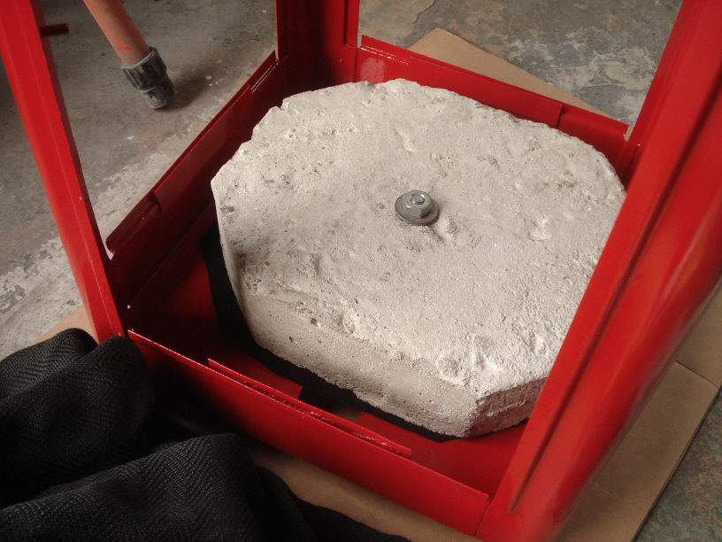 電話台には転倒防止の為に重石が装着されていました。 コンクリート片に穴が開いていて、ボルト止め出来るようになっています。