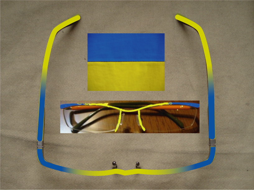 中央にあるメガネの画像と、その上にある「青と黄色」の四角がオーナー様より頂いたイメージ画像です。 イエローとブルーはそれぞれメタリックに変換し、グラデーションでそれぞれの色を結びます。