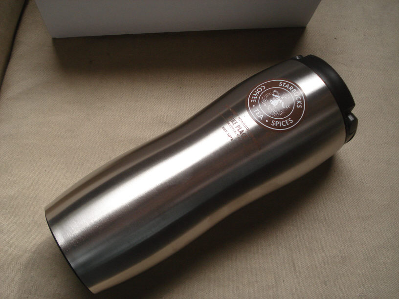 すっかりお馴染みになりましたスターバックスのタンブラーですね。ちょっと大きめのベンティサイズでしょうか。初めて見る型で、ステンレス素地にワンポイントとしてスタバのロゴがプリントされています。シールじゃありません。