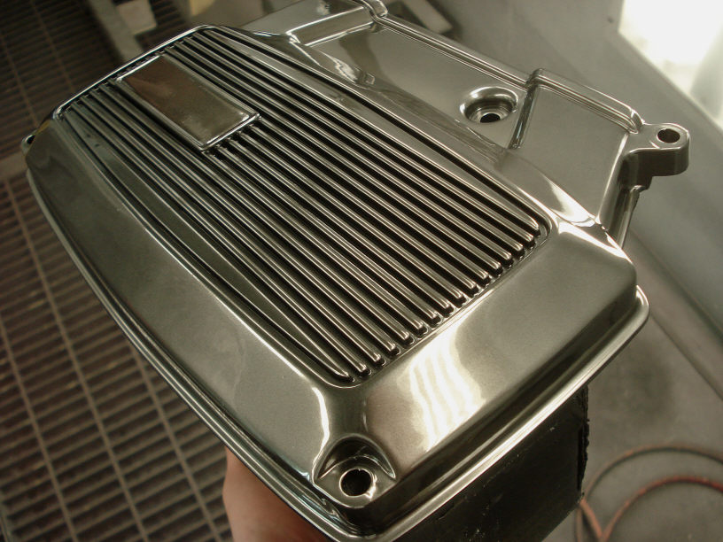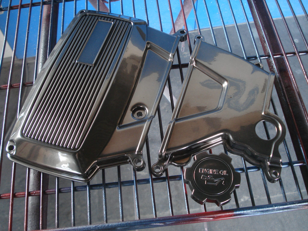 日が当たる場所よりちょっと日陰の方がメッキ感が解りますね。以前のタペットカバーと同じ場所で撮影してみました。メタルな感じに出来ていると思います。