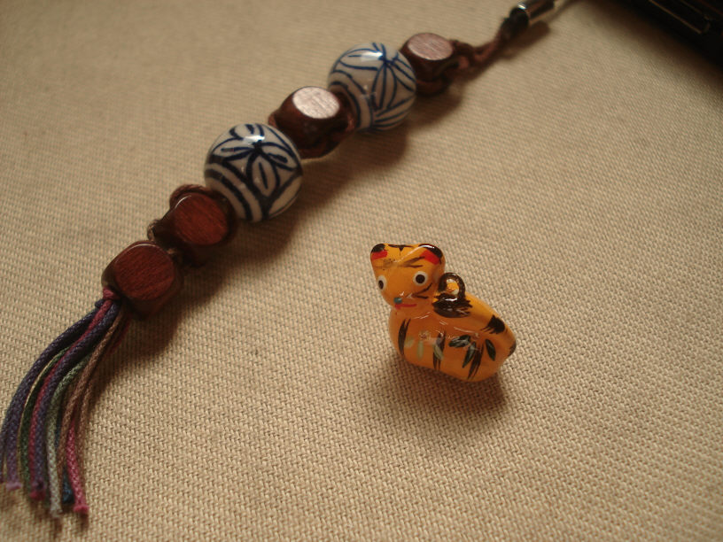 左奥にあるのは私が趣味で作った携帯ストラップです。といっても、各パーツをユザワヤで買って組み合わせただけですが、極小の染付け焼き物なんてアイテムがかなりツボに嵌りました(惚)。