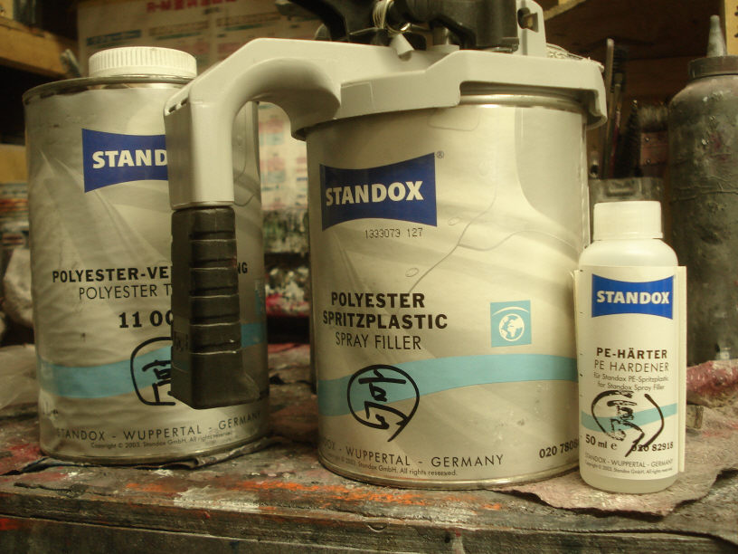 なのでパテ処理が必要ですが、全体的にヘラ付けするのも大変ですので(上下分割で合計すると10面ありますから…)、一気にスプレーパテを塗ってしまいます。その名の通り、スプレー出来るポリエステルパテですね。これは便利です。