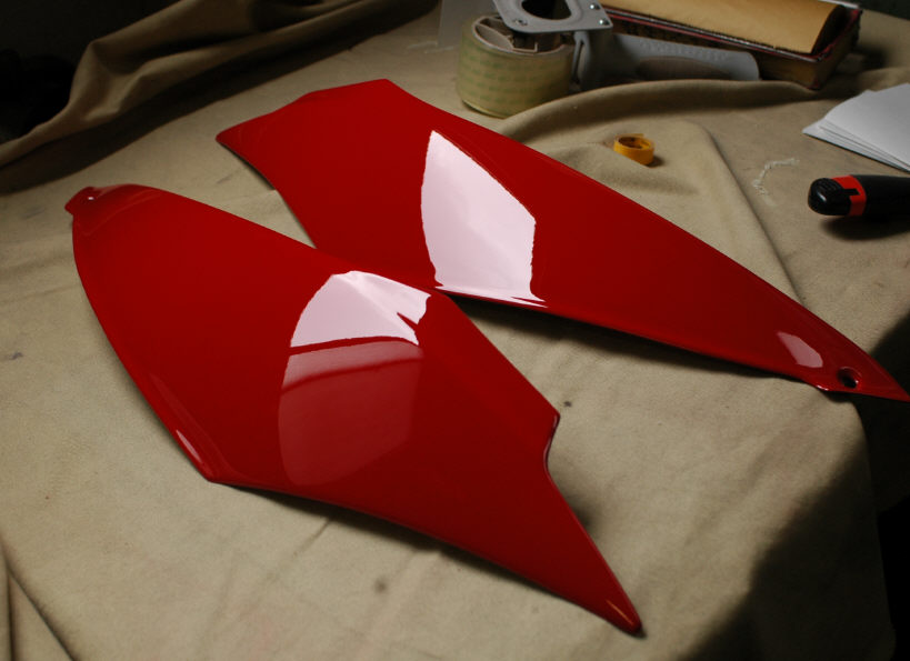 ちなみにサイドカウルカバーもキャリアも磨いてません。お任せコースなので塗りっぱなしですね。 色に関しては「鮮やかな赤なら何でも」との事でしたのでフェラーリの赤です。「良い色だね?」と聞かれたら自慢してあげて下さい(笑)。