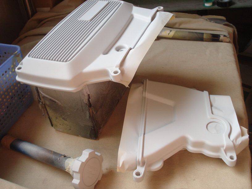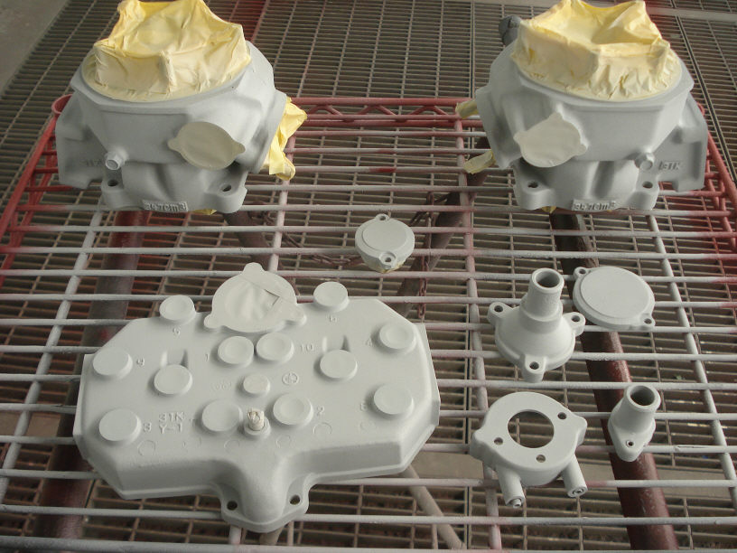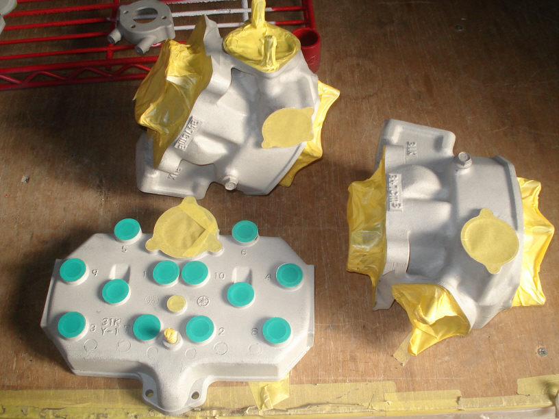 ヘッドカバーとその他小物(5点)もサンドブラストし、その後リン酸処理を行ってからよく水気を取り、次はマスキング作業です。
