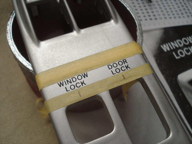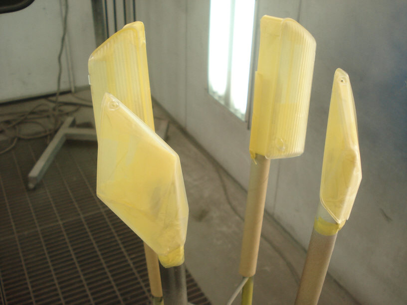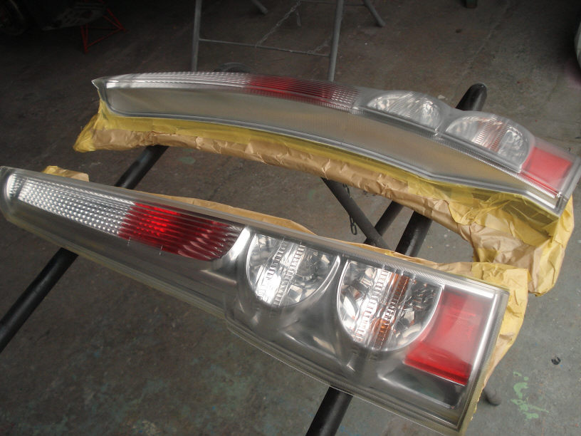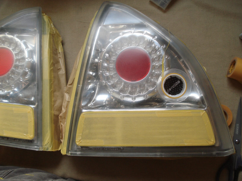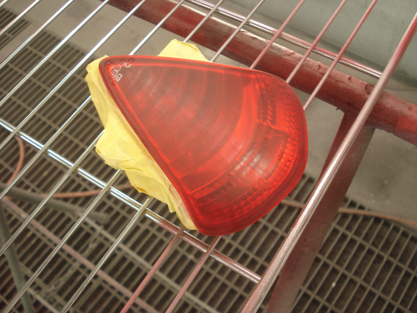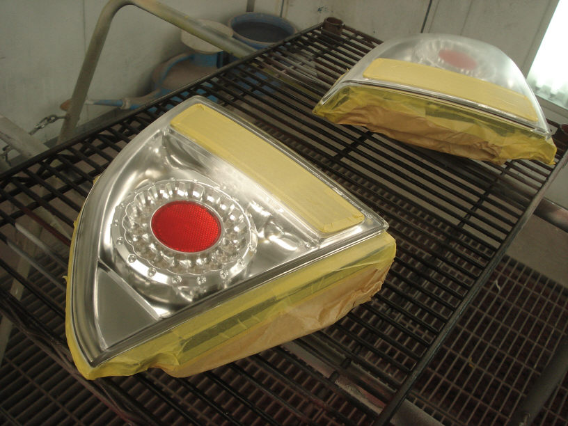 画像は足付け処理が終わって「クリアー抜き」の部分をマスキングしている状態ですね。 こちらのテールランプは、レンズが「一枚物」なのでクリアー抜きする部分の境界線はありません(通常「溝」があったりします)。 なので内部の形状を真上から見ながら、それに沿ってラインを決めます。なのでマスキングはラインテープを途切れる事無く位置を決めながら貼っていきます。適当な感じがしますが、これがまた難しいのです(決める場所が無いだけに…)。