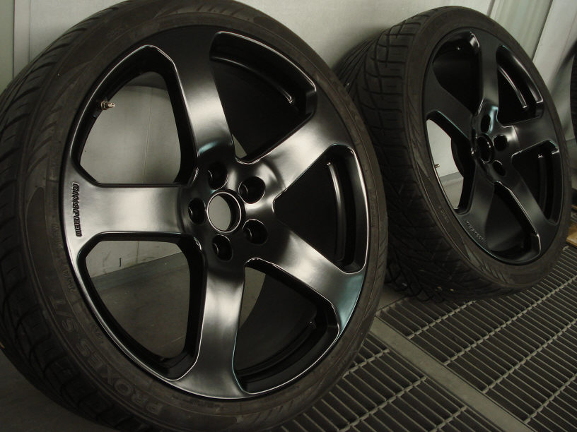 と言う事で画像からは全然話が逸れてしまいましたが、こちらのホイールは2ヶ月くらい前に、以前からご贔屓頂いている業者さんの社長さんのポルシェカイエンに履くホイールですね。元々シルバーの艶々でしたが「7分艶の黒で」とご依頼頂いて塗らせて貰った物ですね。