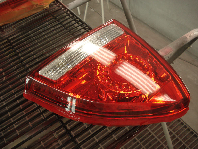 赤い部分の塗装が完了したら、バックランプの「クリアー抜き」部分のマスキングを剥がし、再度プラスチックプライマーを塗ってクリアーに続きます。