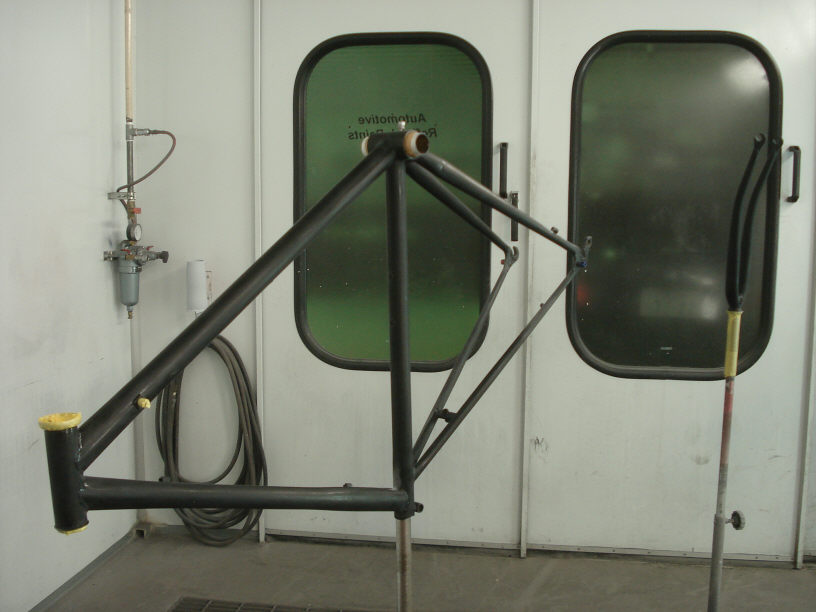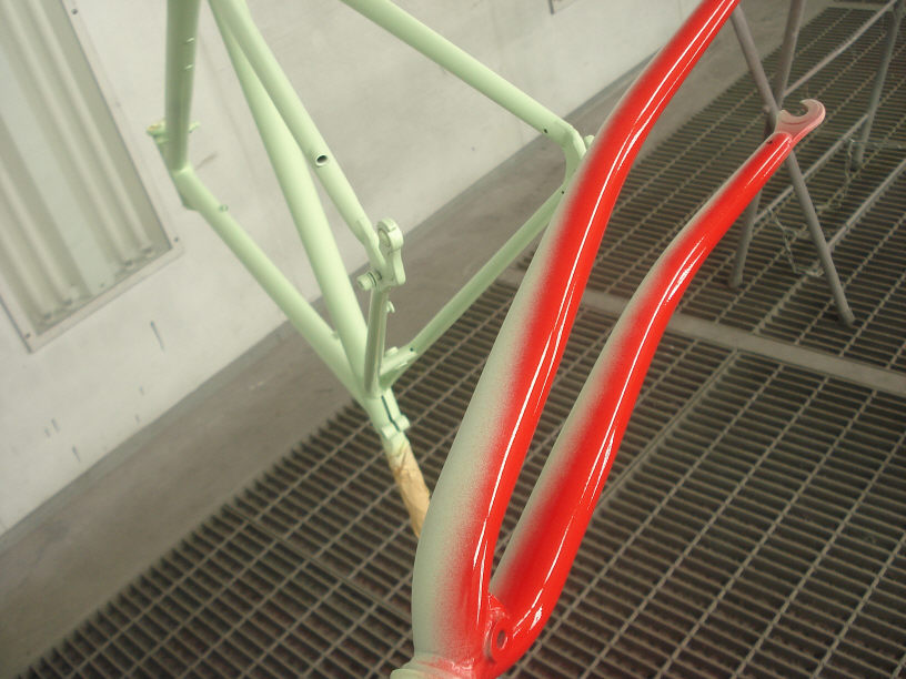 手前のはフロントフォークですね。アルミ製ならばホイールが付くナット部分は塗らないで丸くマスキングしてアルミ素地を残しましたが、クロモリの場合は塗ってしまいます。クロモリ素地が露出していれば錆てしまいますので。 ボルト締めれば塗装は剥がれてしまいますが、それはそれで良いと思います。油でも差しておいて頂ければ錆は出難いと思いますし。