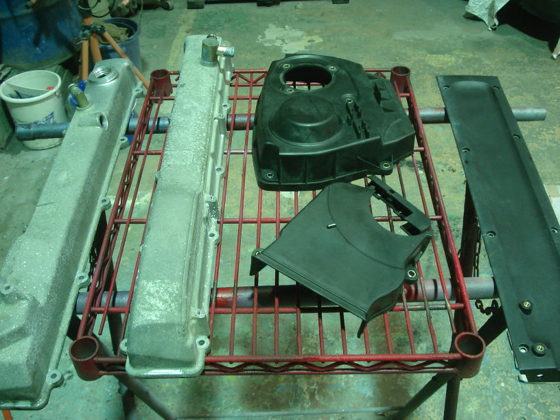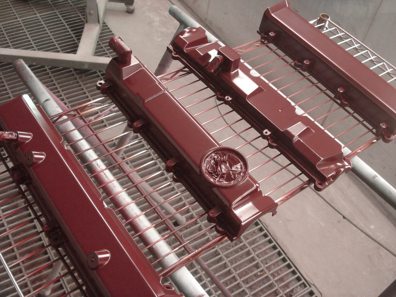 今回はアルミ製のタペットカバー二個とは別に、プラスチック製のプラグカバー(タペットカバーの間に入るカバーですね)と、タイミングベルトカバーの上下も一緒に塗装のご依頼を承っております。 どれも「フェラーリの赤で」ですね。そして「艶々」仕上げです。