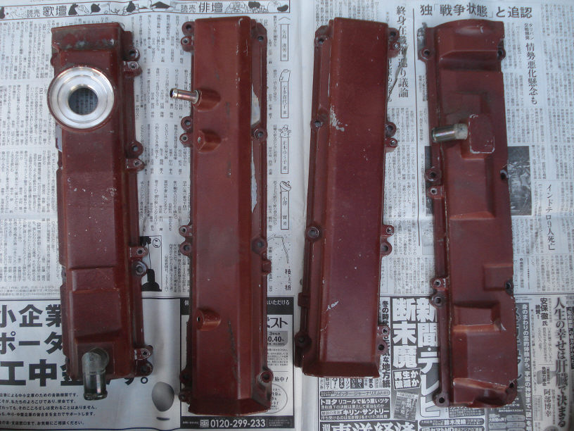 こちらもお待たせしております。サージタンクと一緒にご依頼頂きましたタペットカバー4個ですね。結晶塗装では無く、フラットな塗装です。 古くて茶色っぽく見えますが、どうやらエンジ色な感じです。艶々と言うより半艶ですね。純正同様に復活させます。