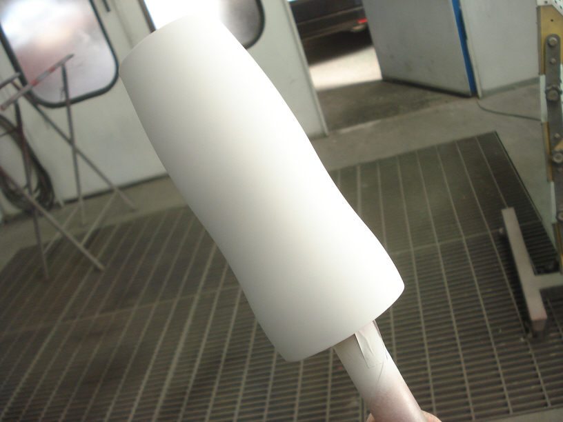 ご依頼内容としては「艶々のフェラーリの赤で!」との事ですので(「!」は勝手に付けましたが…)、艶々になる為の下地を作っています。 画像では白く仕上がってしまっていますが、ちゃんと赤にしますのでご安心下さい(笑)。