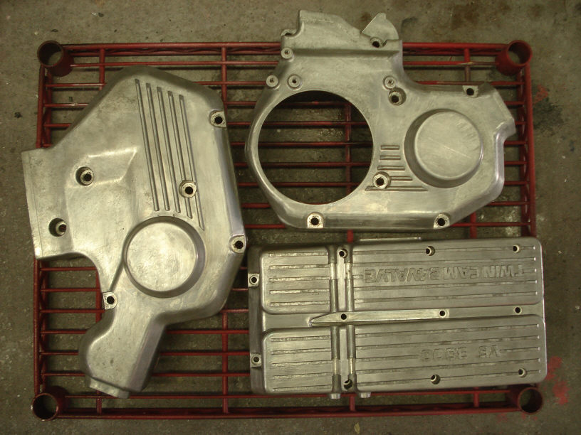 こちらはタイミングベルトカバーですね。これらも元々結晶塗装が施されていました。アルミ製でしっかりした部品です。