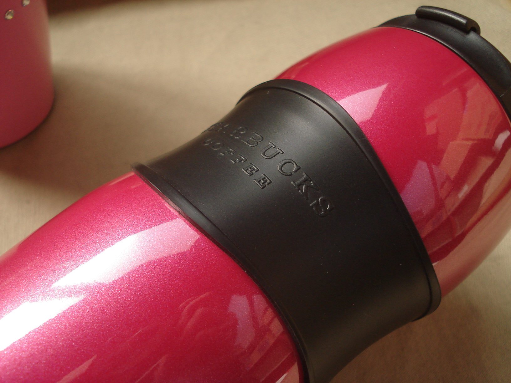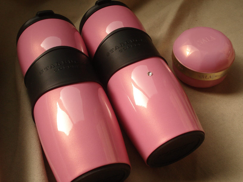 以外にもピンクと艶消しの黒が合って、ちょっと大人なピンクになりますね。スターバックス純正(?)のピンクは、このゴム部分や蓋などが白系だったと思います。このように、2色以上の配色次第で全体的なイメージは全然変わるんですよね。これが色の面白いところです。飽きない訳ですよね…(憧)。