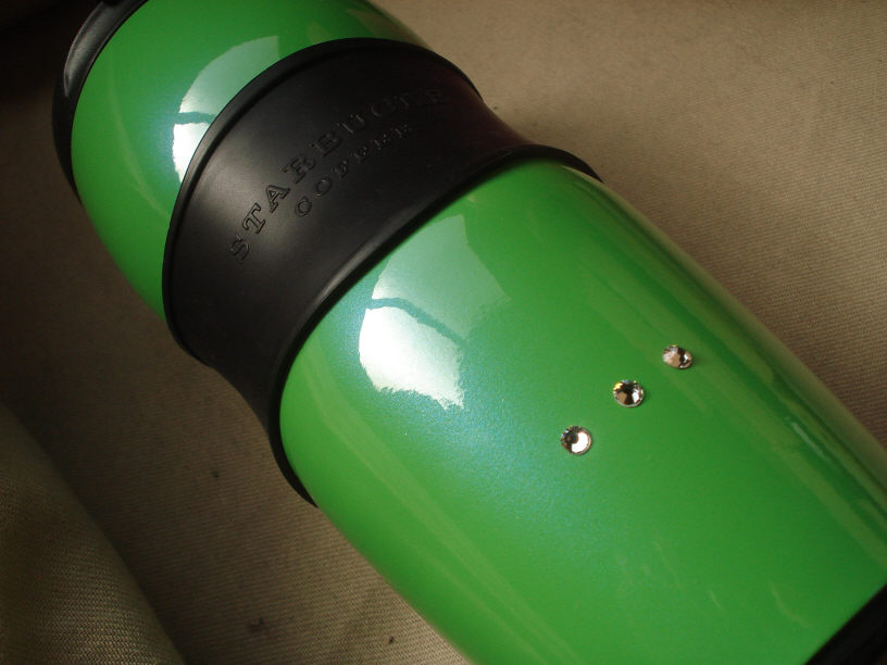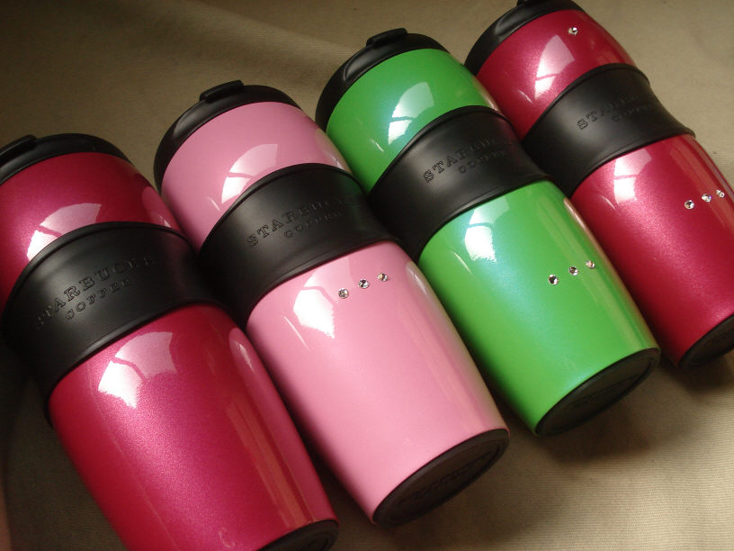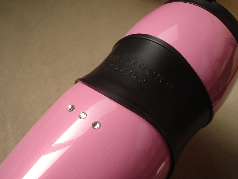 「化粧品のケースと同じような色に」とのご要望を頂いたスターバックスのタンブラーで、一つにはスワロフスキー(クリスタルガラスですね)を貼り付けています。