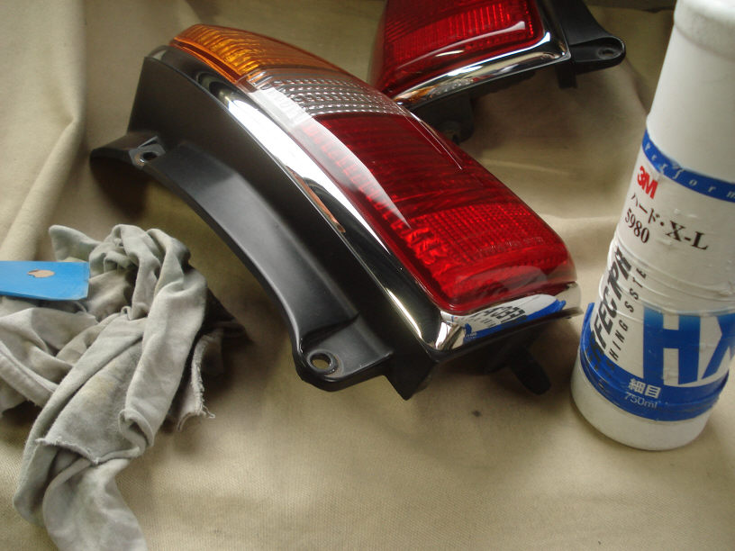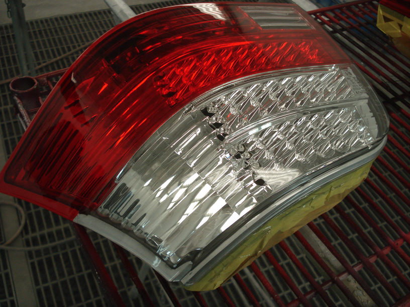 ・到着 ・脱脂洗浄(社外品は特に油っぽいのです…) ・マスキング(裏側の土台部分ですね) ・足付け処理(#1500程度) ・脱脂洗浄 ・エアーブロー ・マスキング(レッドレンズ部分) ・プラスチックプライマー塗布 ・スモーク塗装 ・マスキング剥がし ・プラスチックプライマー塗布(レッドレンズ部) ・クリアー塗装