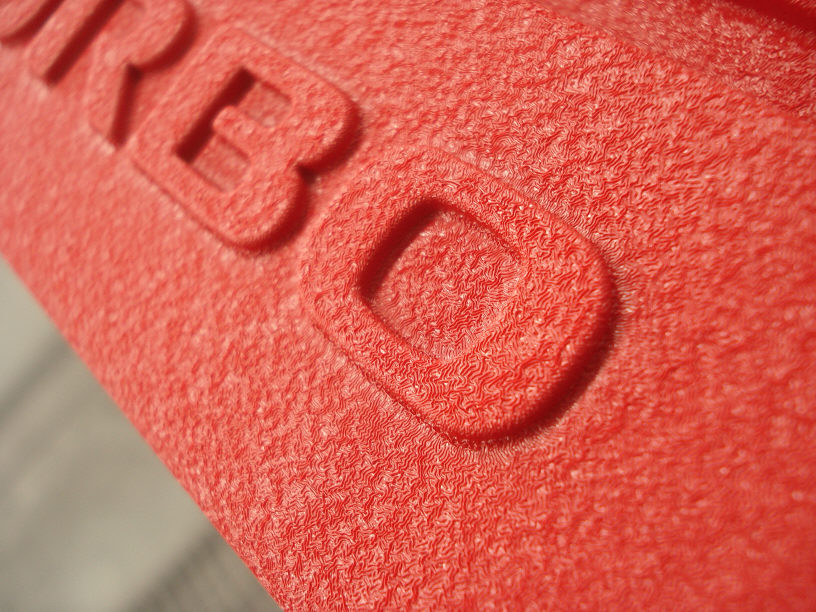 と、話が逸れてしまいましたが、こちらはトヨタプロボックスのドアサイドモールですね。 新品部品で、表面はシボ模様になっていますが、このまま塗ってもこの模様のまま仕上がりますので、まずはこれを削り落とさなければなりません。