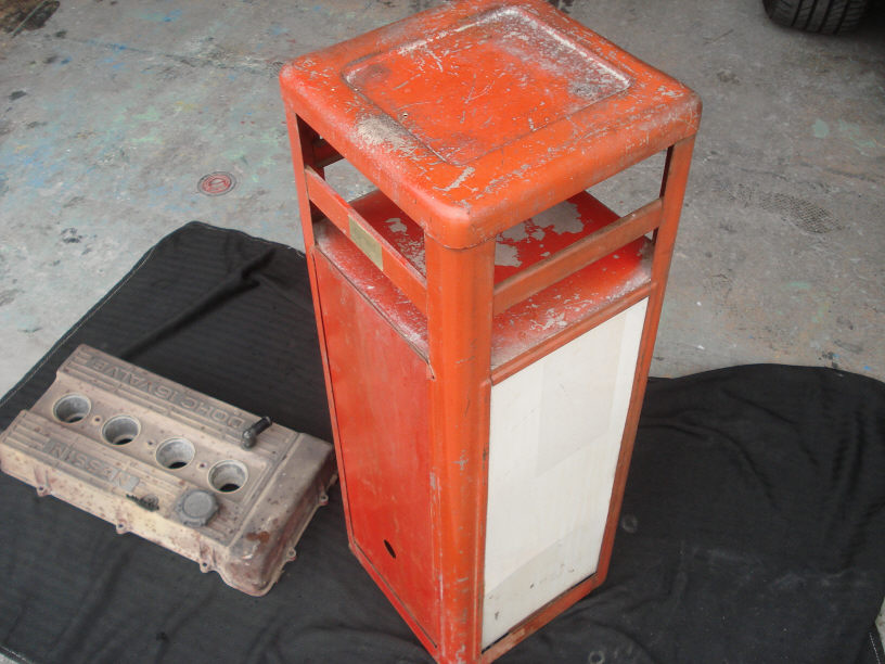 と言うのは冗談で(すいません…)、本当にこの電話機と、これが置かれる専用のスチール棚のレストアと(錆錆です…)、さらにオーナー様の愛機R30スカイライン(鉄火面ですね)のタペットカバーとサージタンクの結晶塗装をご依頼頂きました。 総額にするとかなりの費用なんですが…。私が心配してしまいます…。