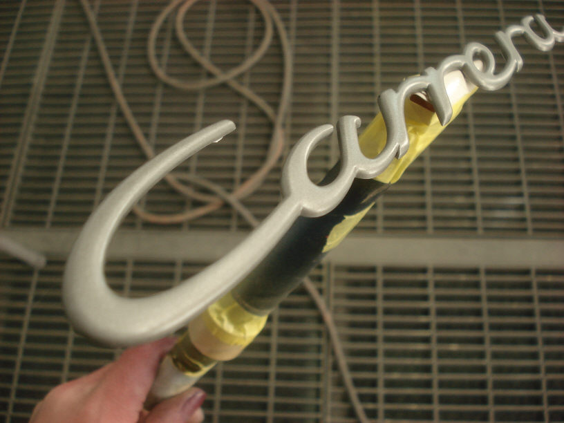 お待たせしました!カレラ純正エンブレム本塗り開始です。 2010/01/28