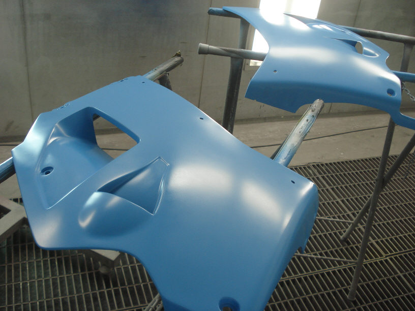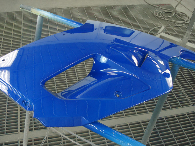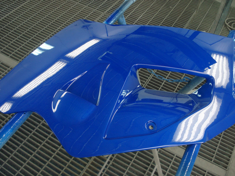 画像奥に見えるのが今回修理するカウルですが、下色に「水色」が塗られているのが見えると思います。メタリックでは無い「ソリッドカラー」ですね。