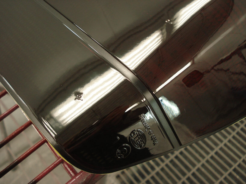 「修理」となると、元の肌(=新車肌)と同じ要に仕上げなければなりませんので、例えばボンネットを画像のテールランプのように「テロテロ」に塗ったりしては駄目です。「修理」としてはこれは最悪ですね。所謂「死に肌」で、塗装屋が見れば「あぁ、ヤリヤリだね」と修復暦が直ぐに解ってしまいます。 なので新車同様の肌、それでいてそれぞれの車体の肌(部位によっても違います)に仕上げる事が必須です。