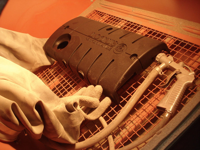 と言うことで、画像は下地処理のサンドブラストです。 いつものようにアルミ製品なら、新品時の素地調整としては「リン酸」による化学的エッチング処理なのですが、今回はプラスチックなのでサンドブラストにて表面を処理して塗装の下地を作ります。 そもそも素材がPA(ポリアミド)なので、塗装の密着は良くは無い製品ですのでこうでもしないと剥がれてしまう為ですね。