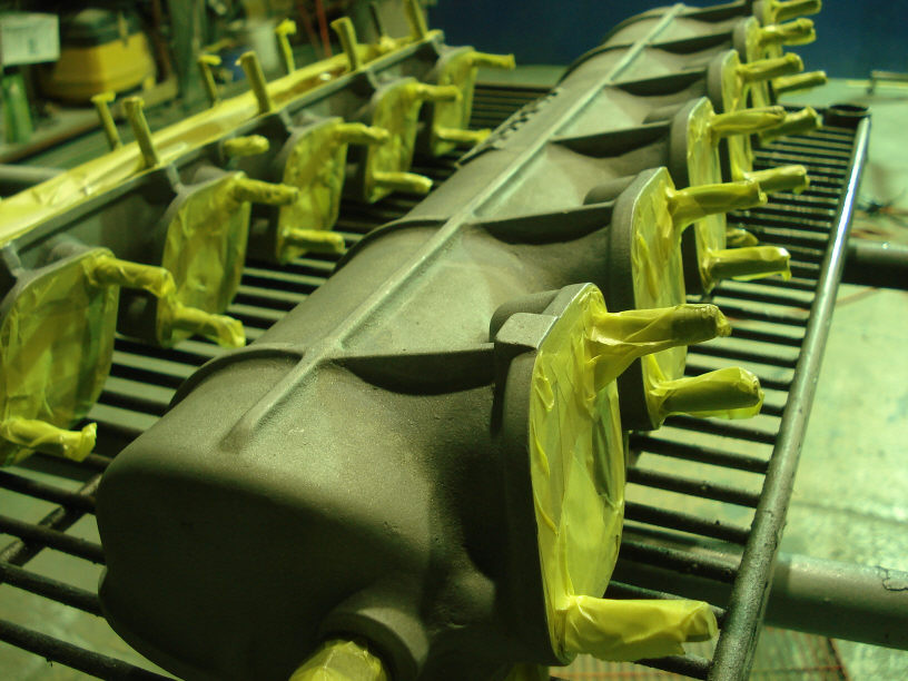 サージタンクやインマニは何が大変かと言うと「マスキング」ですね。 穴は多いし、今回のようにネジが付いたままの物も多いです。 サージタンクから飛び出たネジは26本×2ですので、どれも一つ一つ覆っていきます。 「纏めて貼っちゃえばいいじゃん」は、これをやった事が無い方が言える言葉でして(笑)、ちゃんと一つ一つ貼っていかないと塗れる状態にはならないですよね…。