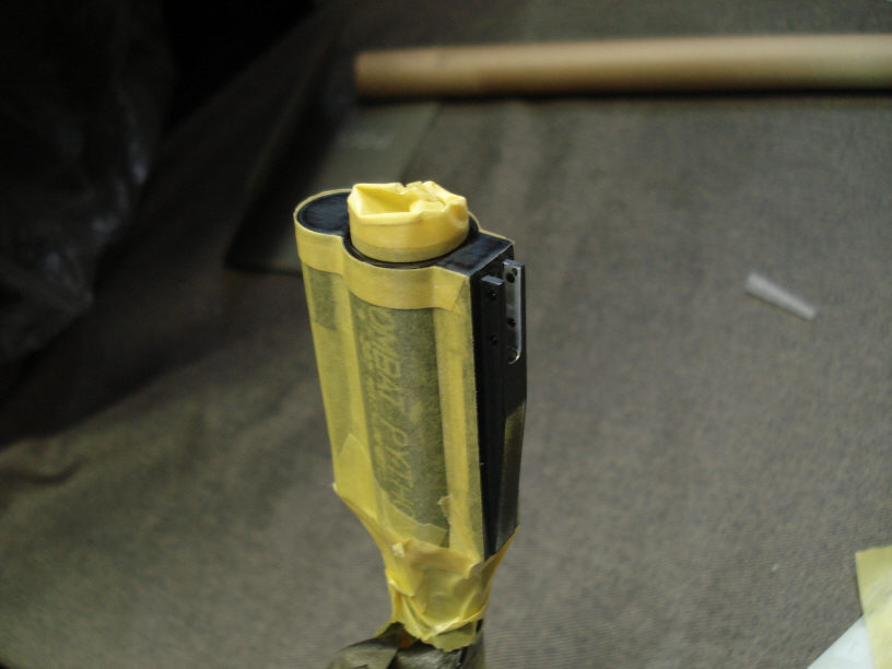 ちなみに「照準」部分の小さなパーツは先に塗っておりまして、仮合わせしましたら見事に入りませんでした(爆)。膜厚がついた分幅が狭くなったのですね。 ある程度想定していましたので、折角塗った塗装ですが削り落としておきます。