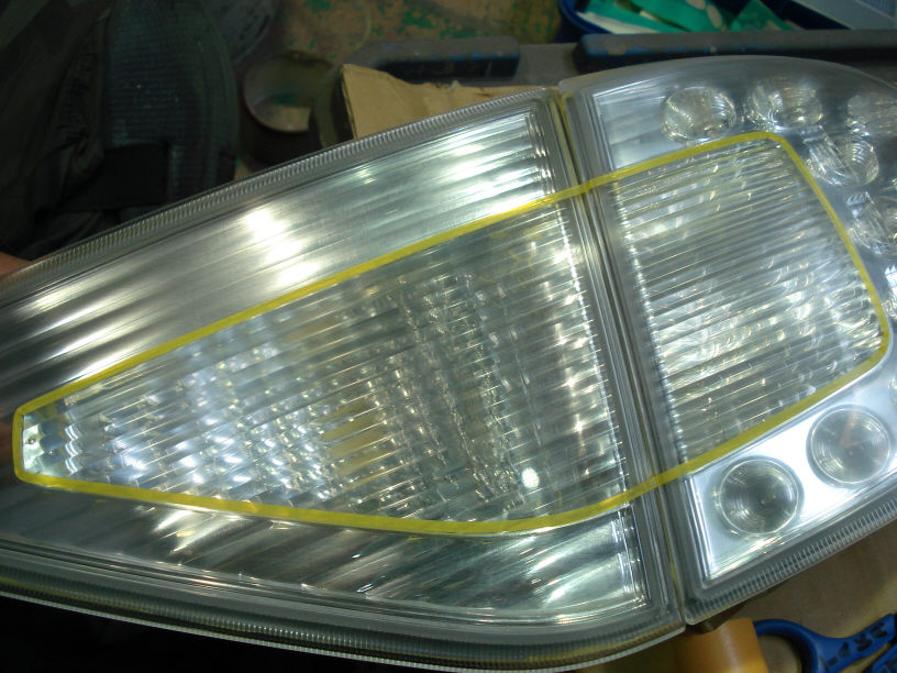 画像はそれぞれ隣り合うテールランプ繋げてマスキングラインの位置確認です。以外にも適当にやると簡単に3mmくらいズレて仕上がってしまいます。