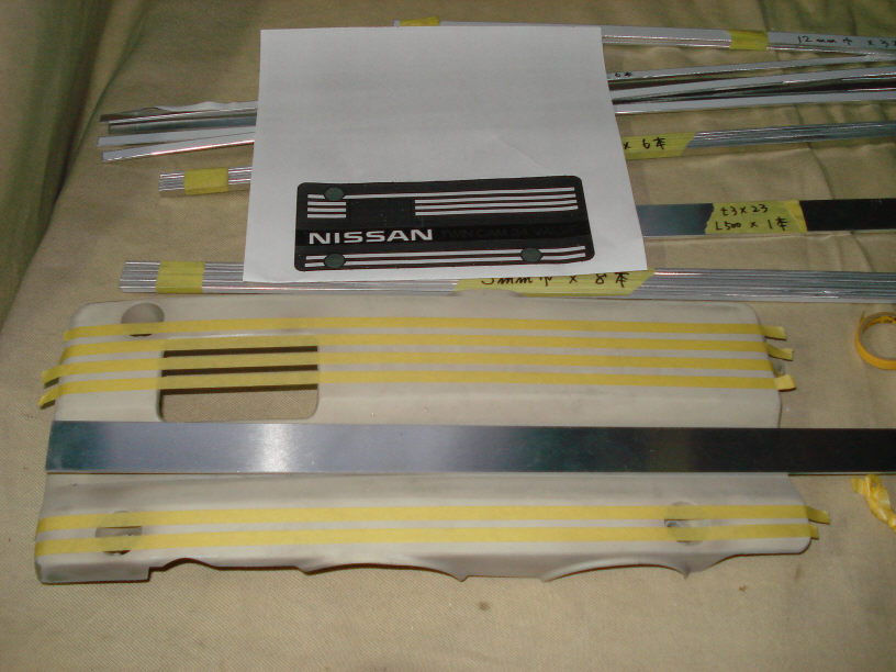 各フィンの部分を削っていつも通りに光らせて、中央の太いプレート部分には「NISSAN」のクリアー抜きに、「TWINCAM24VALVE」のロゴを赤で入れます。