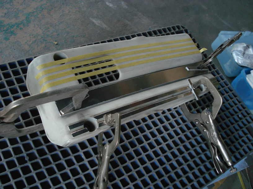 そして再度熱を掛けて完全硬化させてフィンの取り付けが完了です。 C型バイスは板金塗装屋辞めた時に殆ど売っぱらってしまいましたので、自分の2個以外はゴトー氏のを借りました。今回に限らず、身近に板金屋さんが居るととても助かります。感謝感謝です。