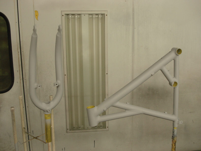 プライマー塗って研いでマスキングされた状態ですね。 写真だとフォーク部分はまだネジ穴に詰め物がされてませんが、この後マスキングしてますのでご安心下さいませ。