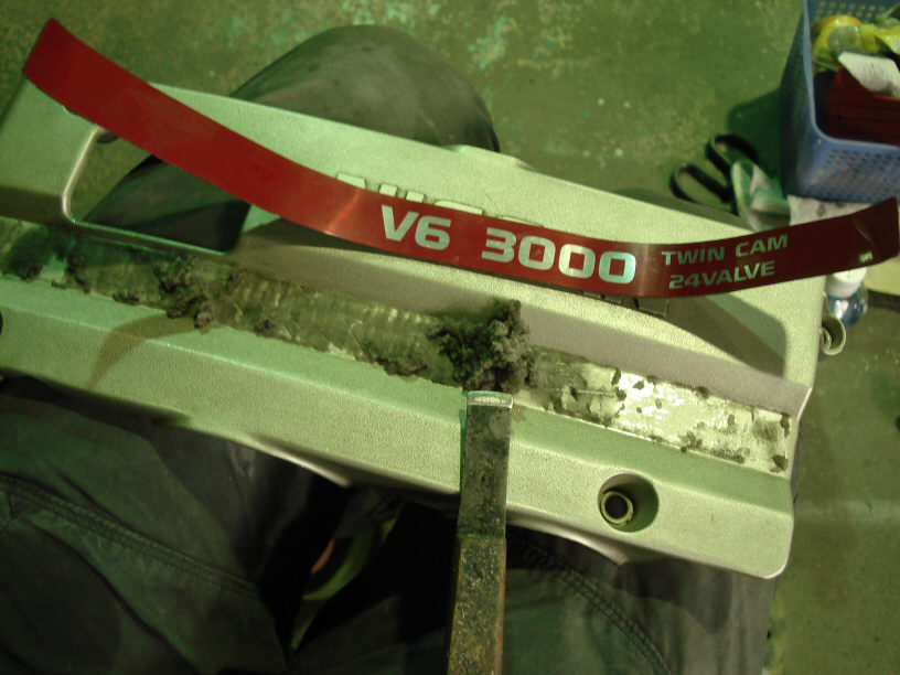先日、凸文字裏側の中空部分に樹脂(エポキシ)を充填しておきましたので、本日表側を除去します。