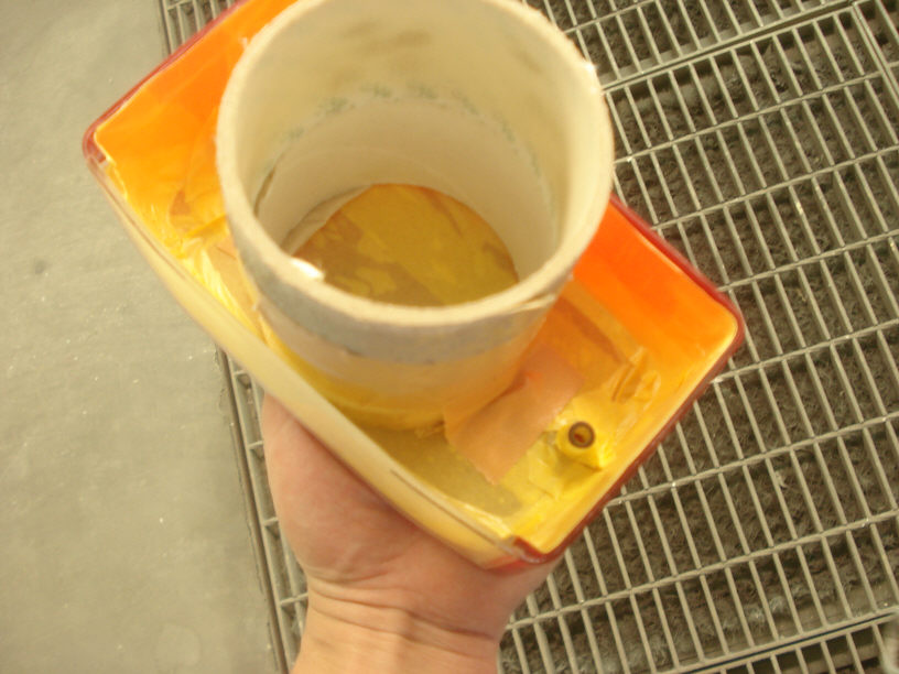 で、塗るときに手で持ったり台に置いたり出来るようにしておきますが、今回はガムテープの芯を3段重ねて固定しています。適当っぽく見えますが(苦)、毎回被塗物の形が違うので専用固定ジグなど作ってはいられません…。なのでこの辺は臨機応変に対応しています。。捨てる筈の物だったので使い捨てでOKですし(といっても繰り返し使ってますが。苦笑)。