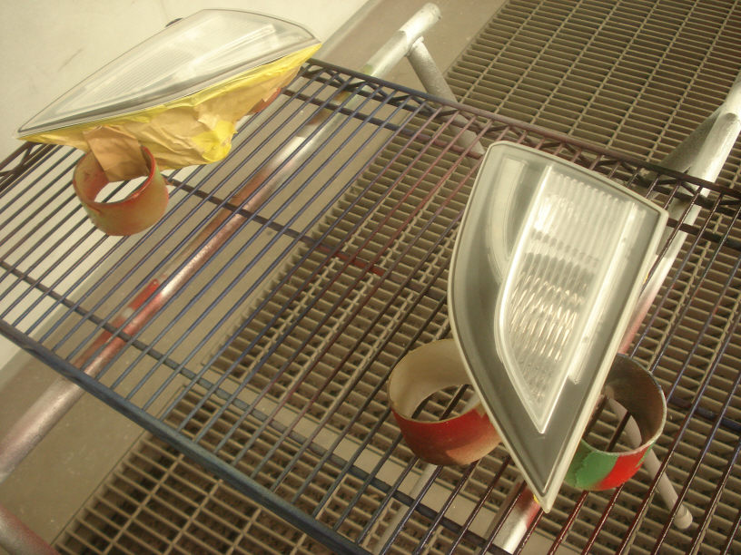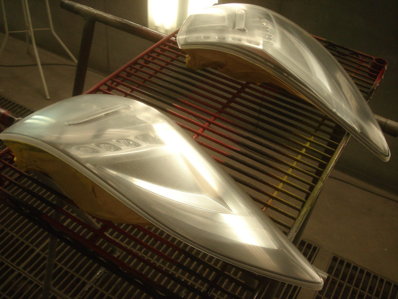 また今回のテールランプはレンズが「一枚物」ではなく、実際には何個かのパーツが組み合わさっています。純正品では結構多いですね。 この組み合わせ部分から泡が吹いたりと結構トラブルも多いので慎重に行います。 中古品の場合には当然傷もありますが、まさかサフェーサーなど塗れませんので(サフェーサーは大抵グレー色です…)、傷の見逃しは最悪です。