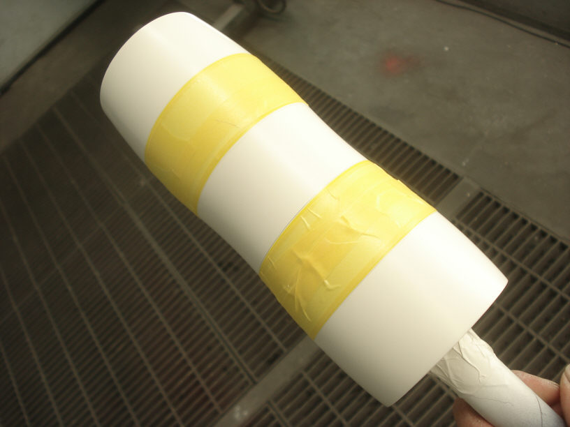 ベースの白を塗ってテープフリーとなった状態でロクロでラインを引き、それに反ってマスキングしていきます。