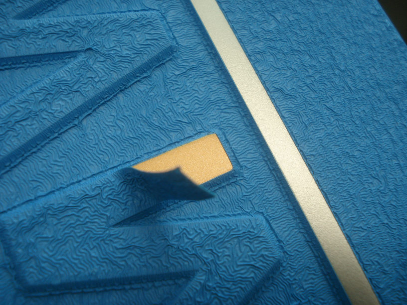 しかし画像見ても解るように、結晶塗装はその特性からして膜厚が凄いのです。チヂレて隆起した分が膜厚になってしまうので、これが「マスキング」の難しいところですね。厚みとしてはマスキングテープを超えてしまうので普通は綺麗に仕上がらないのですが、完全に塗料が硬化する前であればこのように比較的綺麗に剥がすことが出来ます。完全に冷めてしまって硬くなってしまうと大変な事になりますので…。