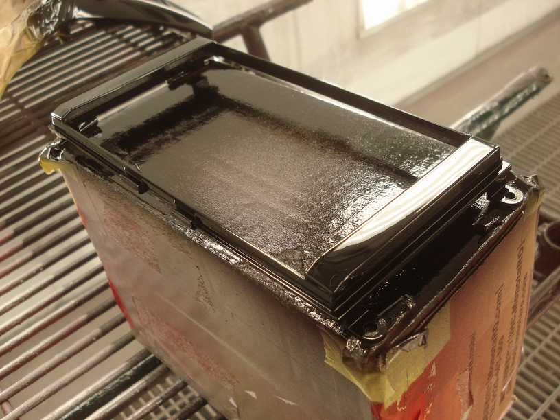 これは「焼き付け塗装」でメラミン系樹脂なので「焼く」といった表現は正しいのですが(それでも「低温焼き付け」といった部類です)、いつも使っているSTANDOXの塗装は2液性のアクリルポリウレタン樹脂なので「焼く」とはちょっとニュアンスが違います。 自然乾燥でも固まるには固まるのですから。主剤と硬化剤が反応して分子間が結合して硬化するのです。