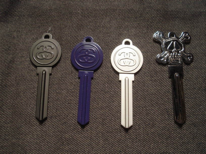 ご依頼内容としては、右から二番目のホワイトパールが色見本でこれと同じようにして欲しいとの事です。グレーのは返却で、塗るのは一番右のメッキの物と紫の鍵の2つです。