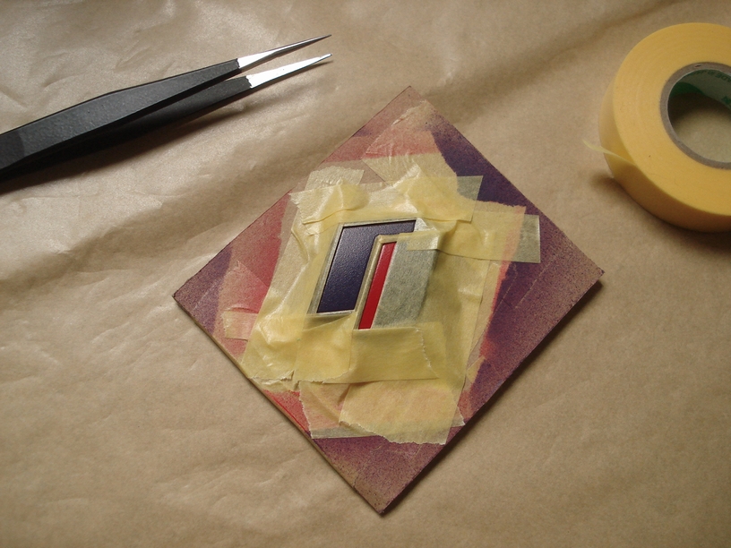 ここでのマスキングは、先ほど塗った赤と紫より一回り大きめにするのがコツです。大き目といっても0.1mm程度ずらすだけなんですけどね。さすがに目が疲れます(笑)。