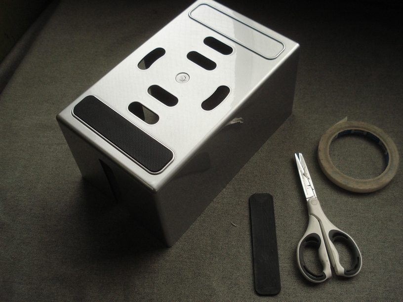 両面テープで付いていたので新たにテープを貼りなおして付けます。滑り止めの効果はもちろん、少し浮くようになるので内部の熱が逃げる(いや下側だから給気口ですかね)構造になっているようです。