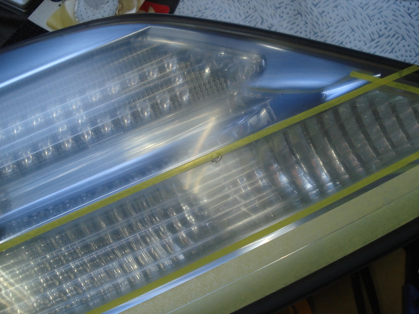 画像は既に足付け処理が施されてマスキングが終わった状態ですね。テールランプ内部には通常はあり得ないLED電球が埋め込まれています(凄)。