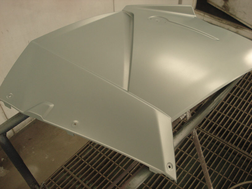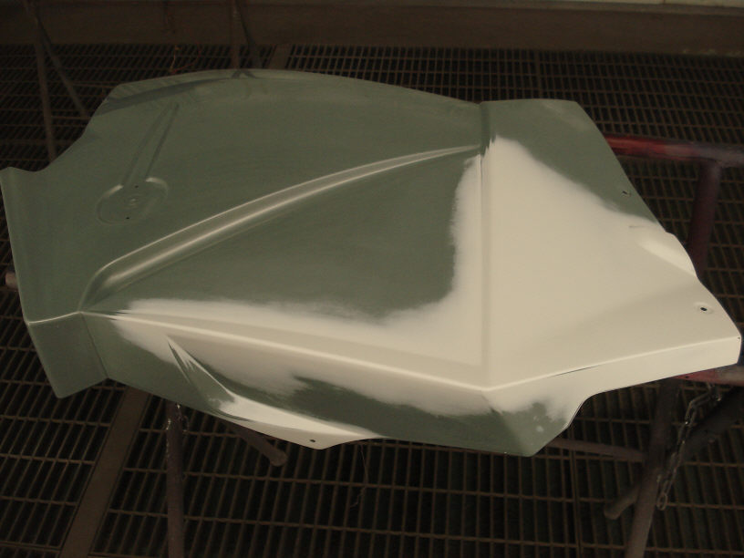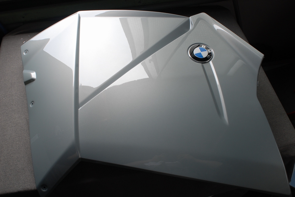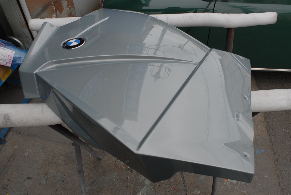 昨日下地処理を終えたBMWのサイドカウルです。本日朝から本塗りの為のセッティングを行い、先ほど無事本塗り完了しました。お待たせしました!