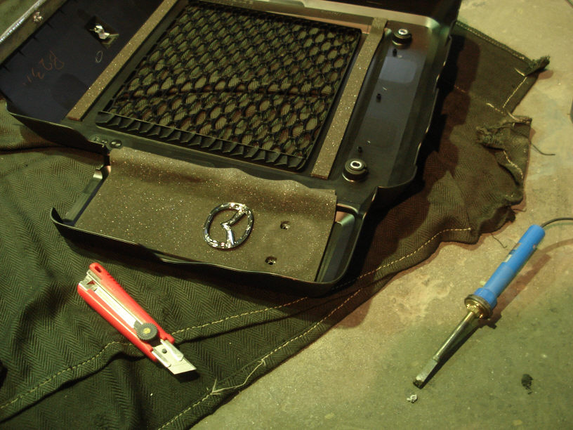 マツダのメッキエンブレムにはピンがついていて、エンジンカバーの穴に刺さって裏側を溶かして固定しています。 さらにその上にスポンジシートが張ってあるので、その部分をカッターで切り抜いてハンダで溶かして外します(外しました)。