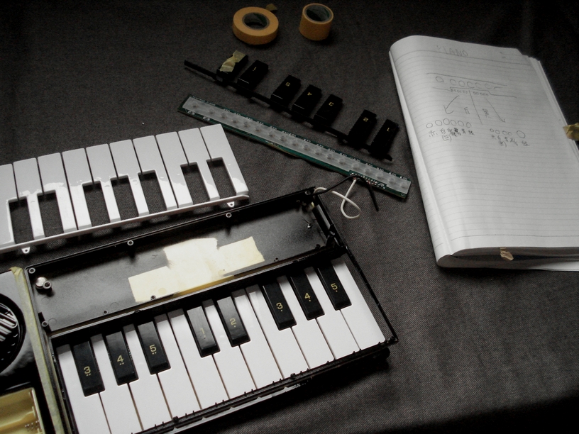 塗りたてのマスキングした状態ではちょっと心配になりましたが(真っ黒べた塗りでしたからね)、鍵盤の白とのモノトーンな組み合わせで凄く上品な感じに仕上がっています。おもちゃのピアノとは思えませんね…。
