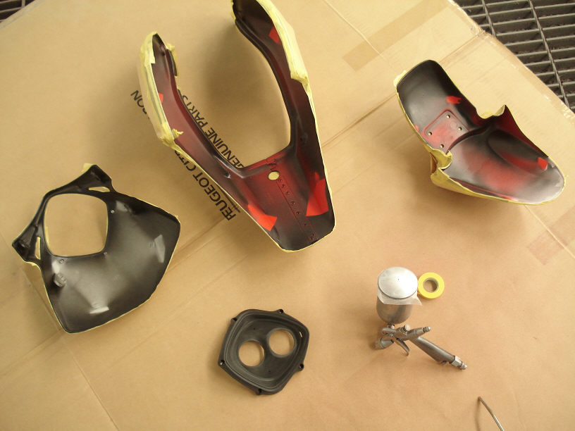 画像は下地処理中の状態です。 赤いパーツは塗装されているのではなく、樹脂(プラスチック)自体が赤いのです。素材はPPだと思います。